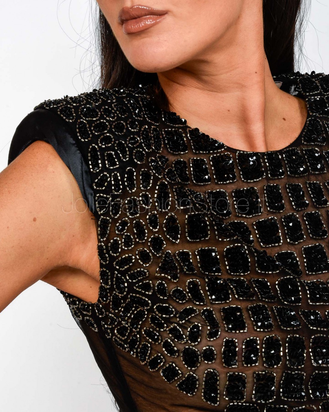 Abito midi in crêpe leggero dalla vestibilità aderente. Il vestito ha spalle strutturate e si distingue per il top impreziosito da brillanti ricami con disegno cocco, a donare luce e tridimensionalità alla texture. I tagli cut-out con inserti in tulle esaltano la linea decisa del capo e disegnano una silhouette geometrica.