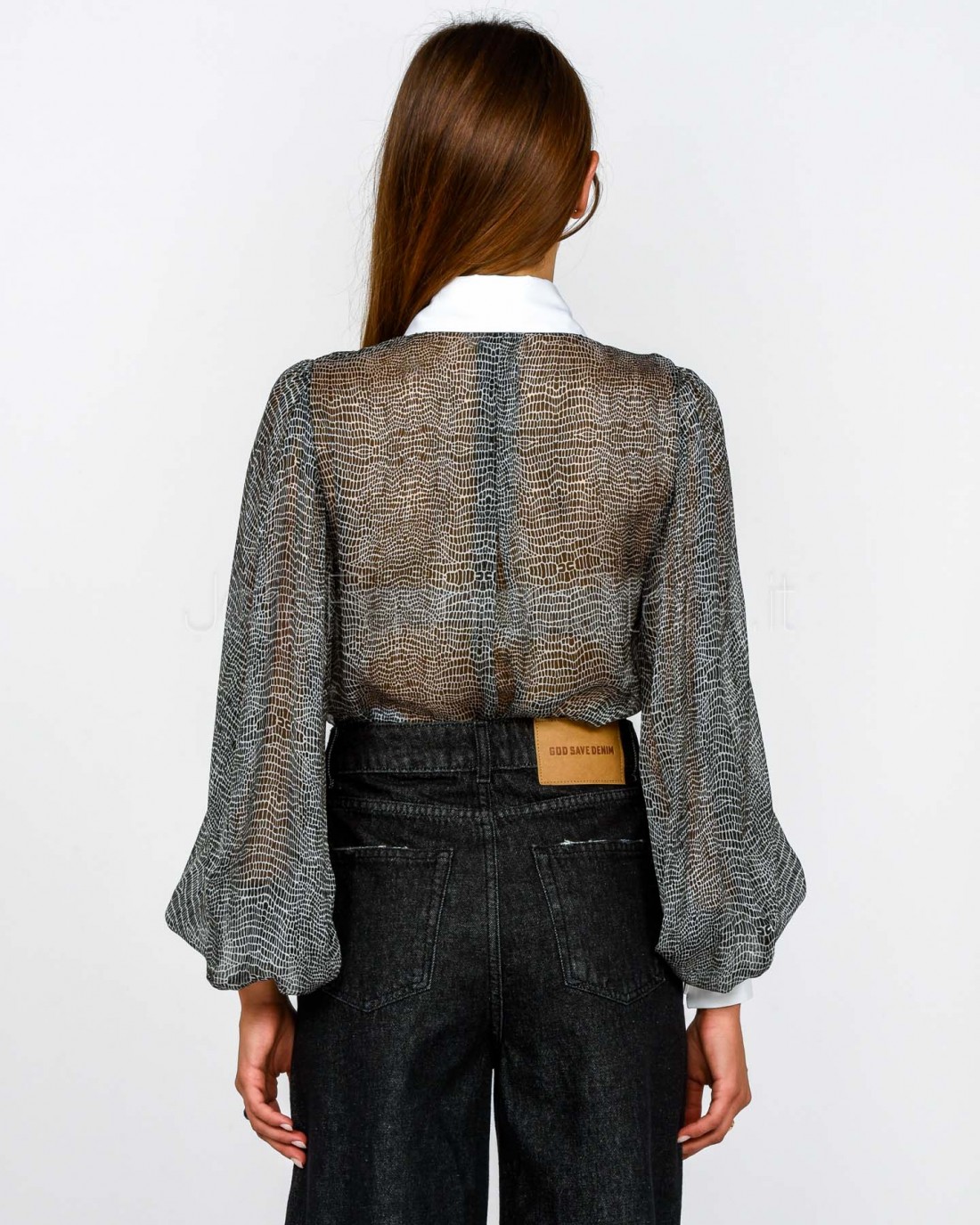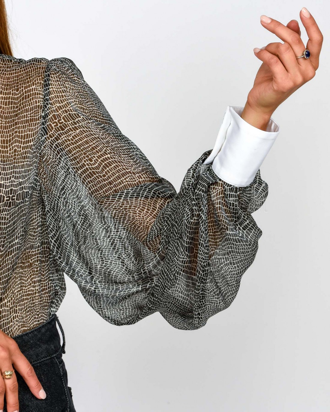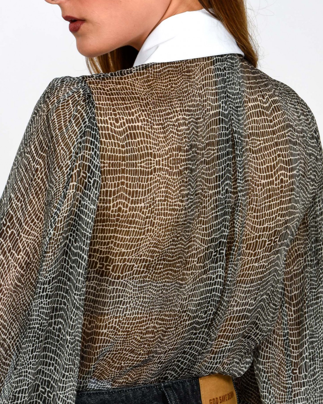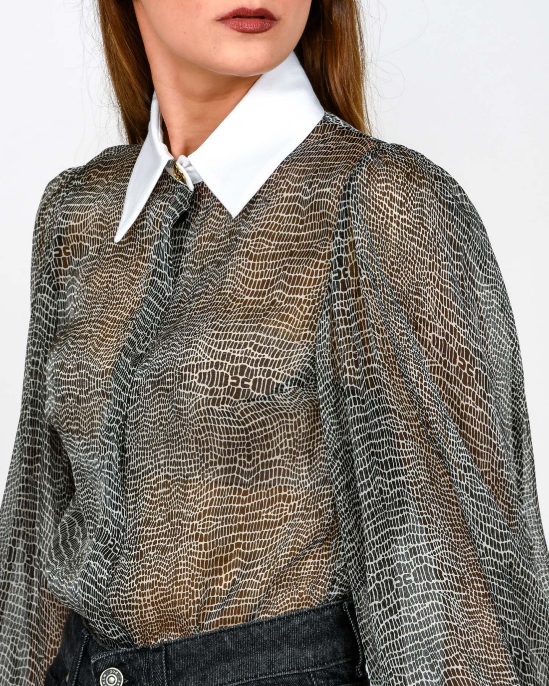 Body in voile dalla vestibilità slim. Si distingue per il colletto e i polsi ispirati al mondo della camiceria, con maniche ampie che regalano volumi inediti. Protagonista è la stampa con fantasia pitone che dona movimento.