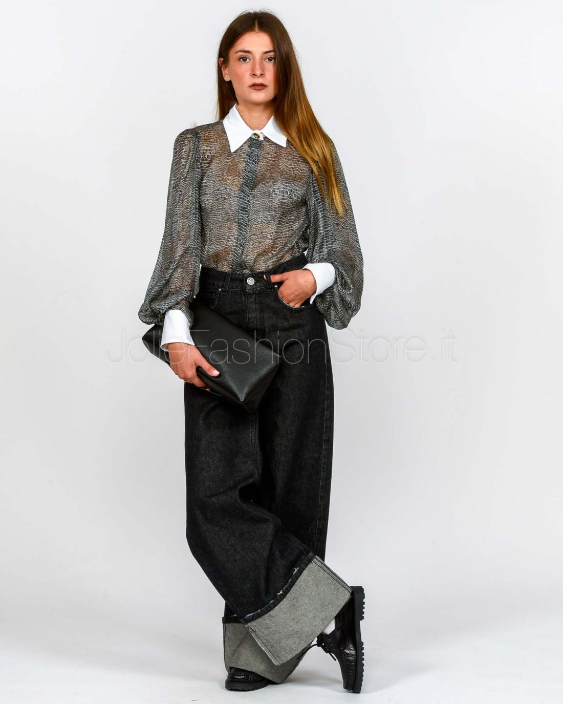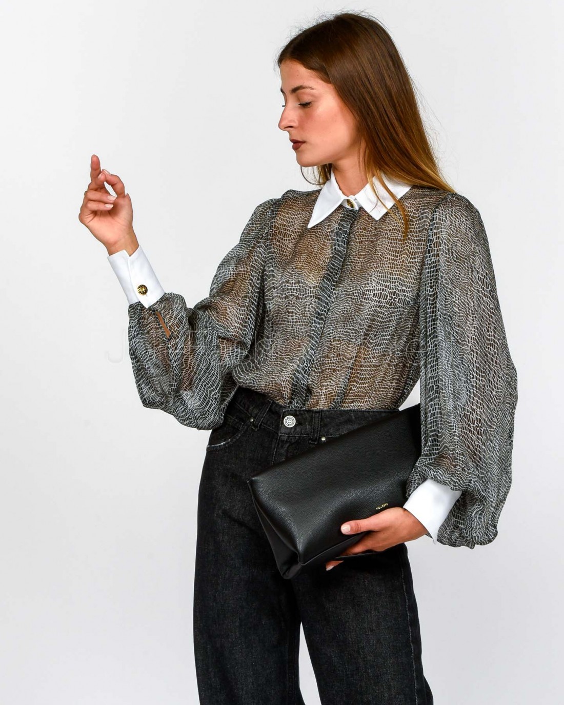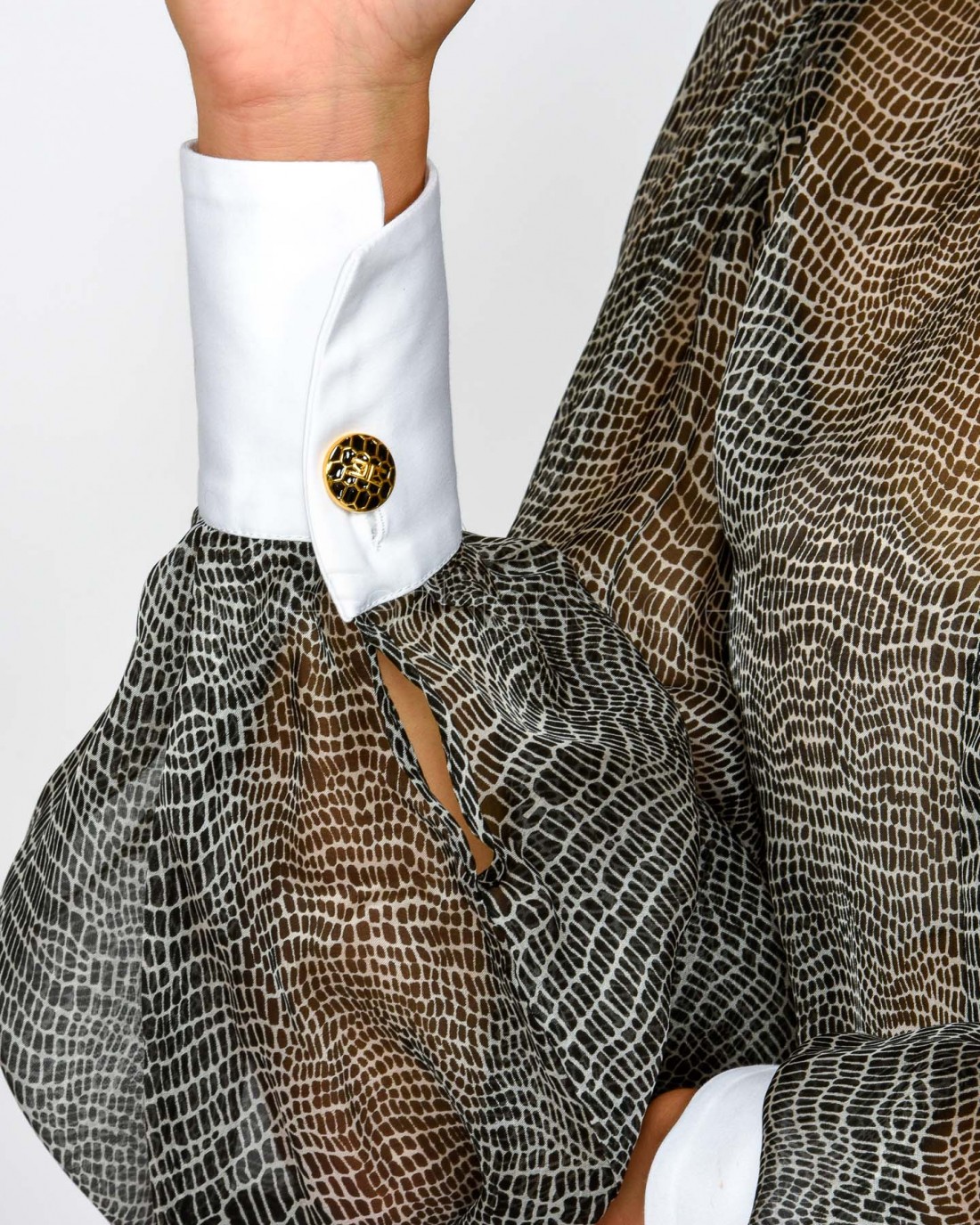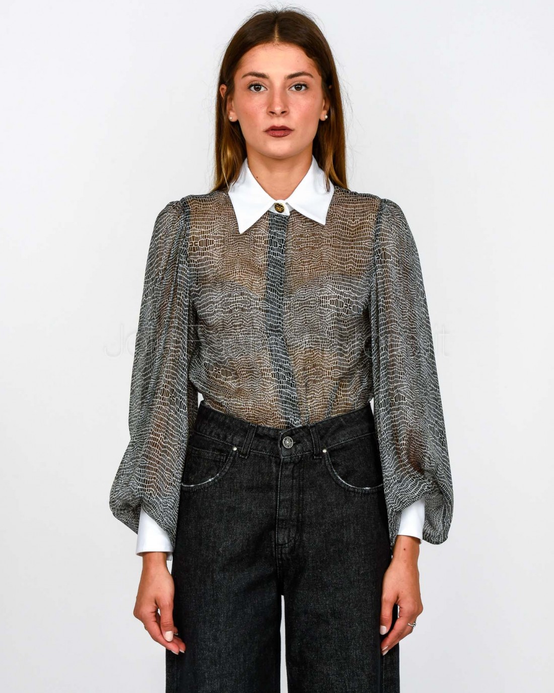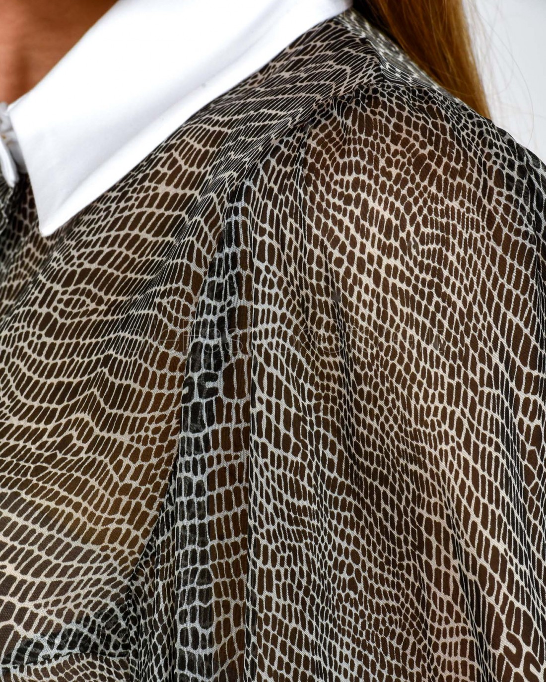 Body in voile dalla vestibilità slim. Si distingue per il colletto e i polsi ispirati al mondo della camiceria, con maniche ampie che regalano volumi inediti. Protagonista è la stampa con fantasia pitone che dona movimento.