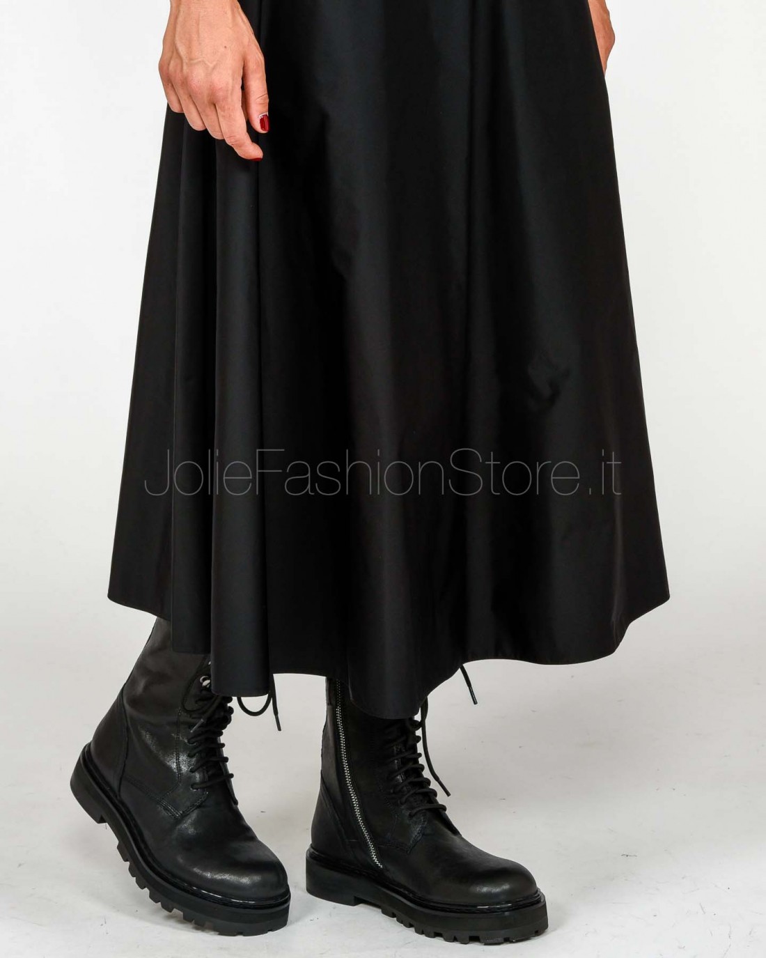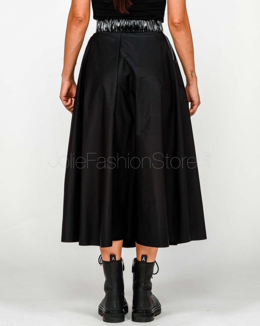 Gonna midi in tessuto vela dalla vestibilità regular. La linea a ruota dona movimento alla silhouette, definita in vita dalla cintura in vinile con logo in metallo dorato ad aggiungere una nota di luce.