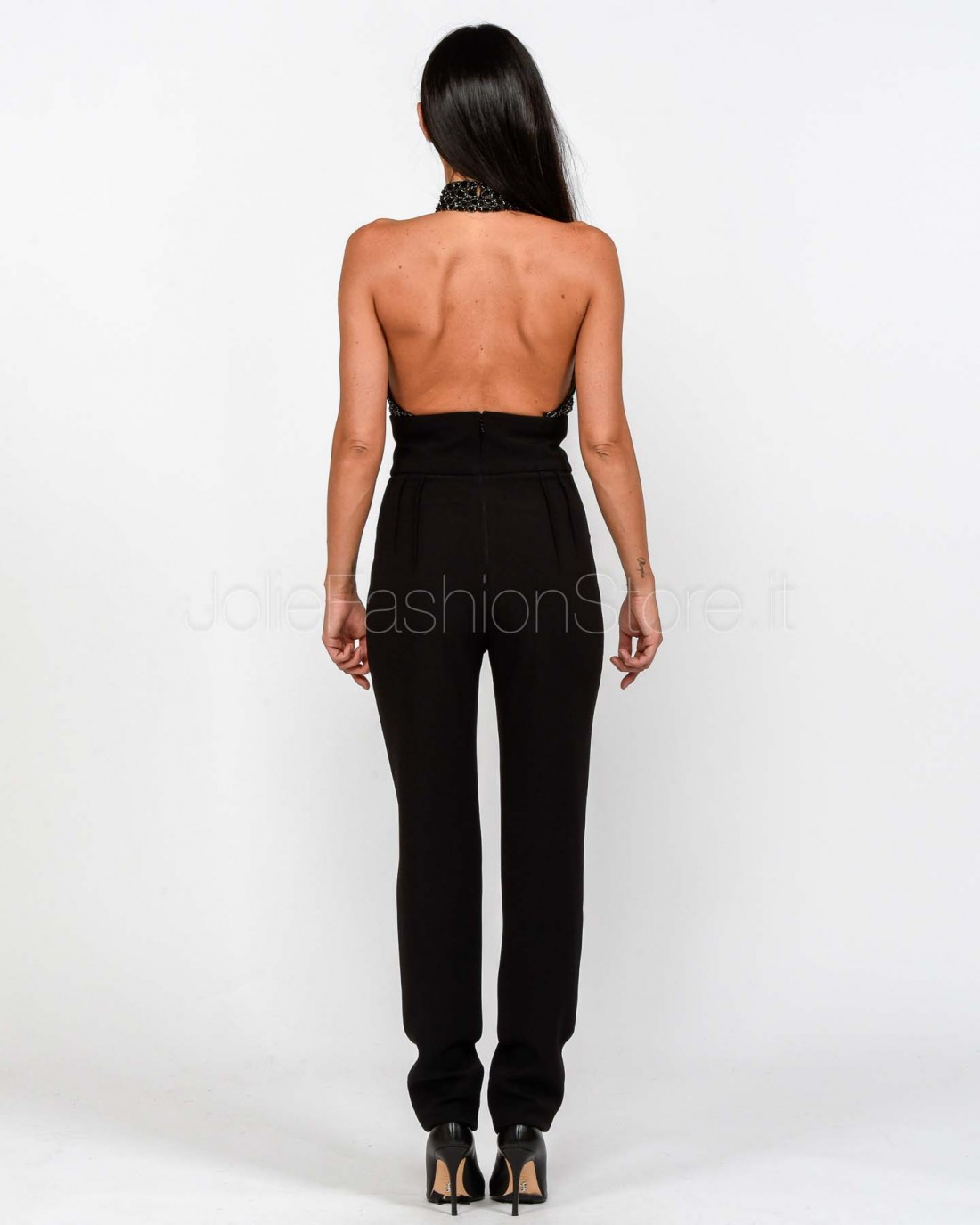 Elisabetta Franchi Tuta in Crêpe Leggero e Tulle con Ricami Cocco Nero